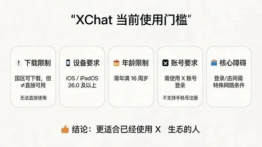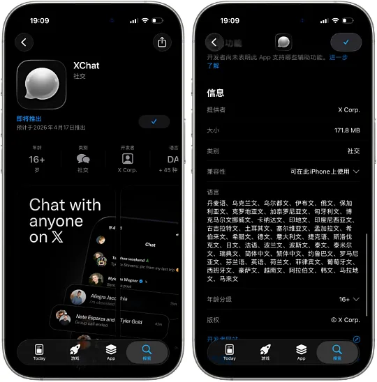 这款全新聊天APP选择在苹果iOS端首发,官方明确表示,将于2026年4月17日在全球范围内的App Store开放下载,安卓版本则会在后续逐步迭代推出,满足不同系统用户的需求。最让国内小伙伴惊喜的是,XChat不仅全面支持简体中文,就连中国大陆区App Store(国区)也能直接下载,打破了海外热门APP国区难寻的惯例。不过想要体验这款APP,门槛也不算低,设备必须升级至iOS/iPadOS 26.0及以上版本,同时仅限16岁及以上用户注册使用。