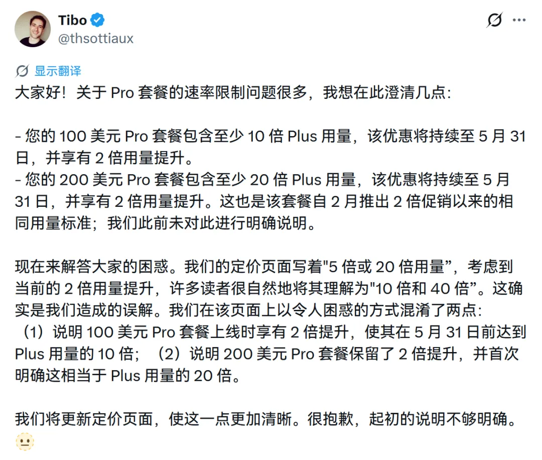 来源是 OpenAI 成员在 X 的公开说明,核心是修正页面“5 倍或 20 倍”表述歧义。