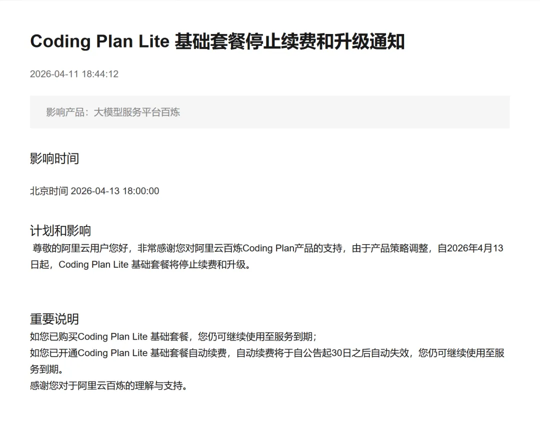 B) 04-12 00:24 阿里云百炼停售并清退 Coding Plan Lite