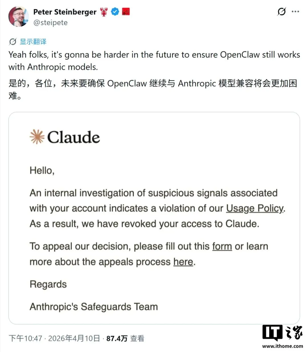 IT 之家报道,OpenClaw 创始人相关 Claude 账号曾短暂被封,后续恢复访问。事件使开发者再次关注模型平台在安全风控、计费策略与生态公平之间的平衡。