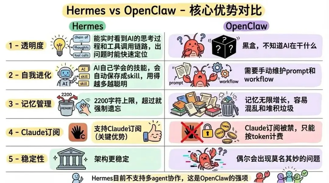 Hermes Agent与OpenClaw的根本区别在于架构设计哲学。OpenClaw基于Node.js,采用事件驱动的异步回调模式,虽然在处理简单任务时反应迅速,但在复杂多步任务中容易出现状态混乱和回调地狱。相比之下,Hermes Agent采用Python编写的同步循环,通过单一阻塞循环实现对控制流的完全掌控,确保了任务执行的确定性和稳定性。