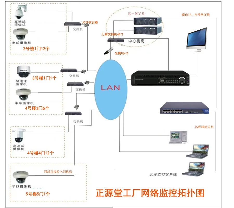 1) 本次项目建设为正源堂医药公司的全网络架构的高清视频监控系统。系统全部网络数字化,前端选用百万高清型网络摄像机,并以此来架构一个全数字的专有公司视频监控网络系统。在每个重点监控区域部署高清网络摄像机,通过监控专有网络,连接到后端部署在信息中心的NVR服务器集群,并通过一台集中管理服务器,实现一个系统管理平台对所有监控点的前端摄像机、NVR、高清解码器等设备的视频浏览、控制、报警联动、录像检索和回放等全局管理。系统同时接入数字信息化专网,实现视频监控和门禁、报警、消防、巡更等系统的无缝对接和信息共享。具体如下: