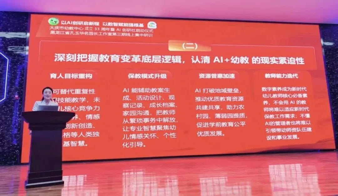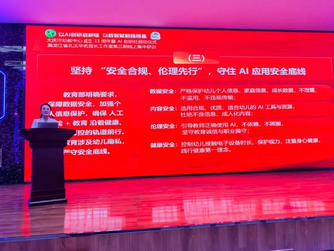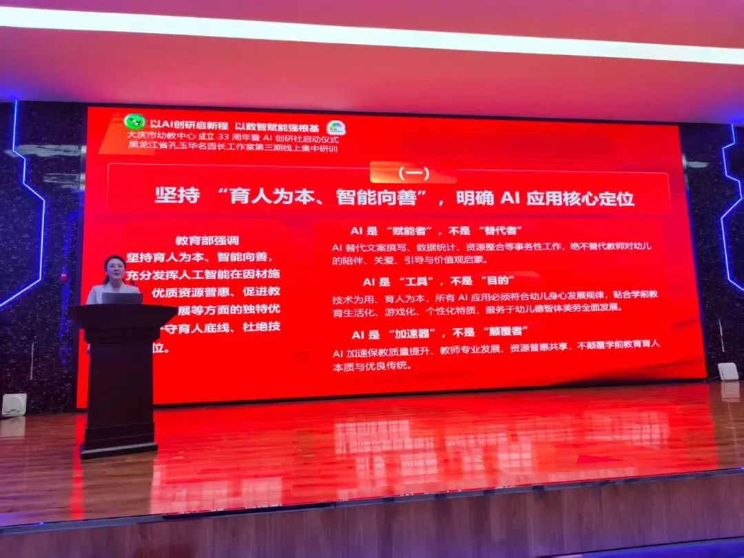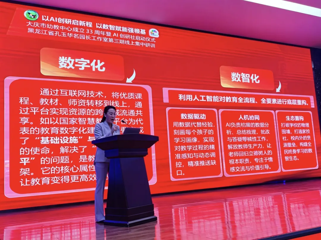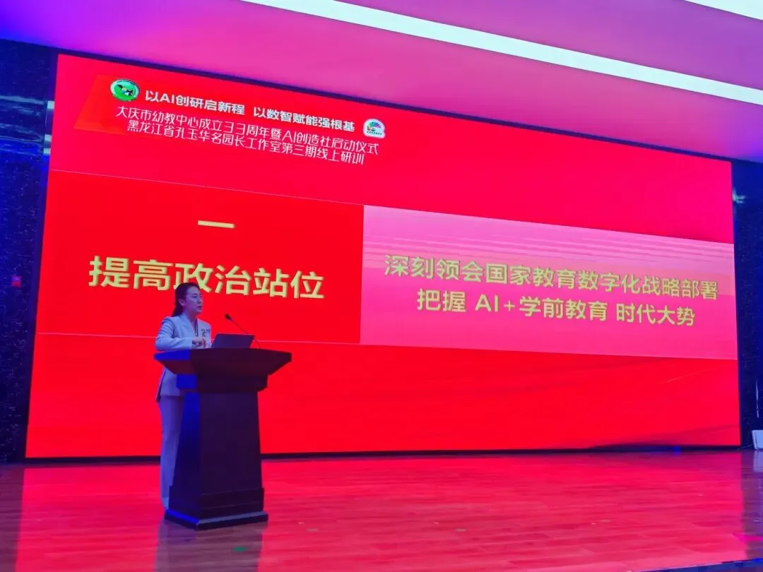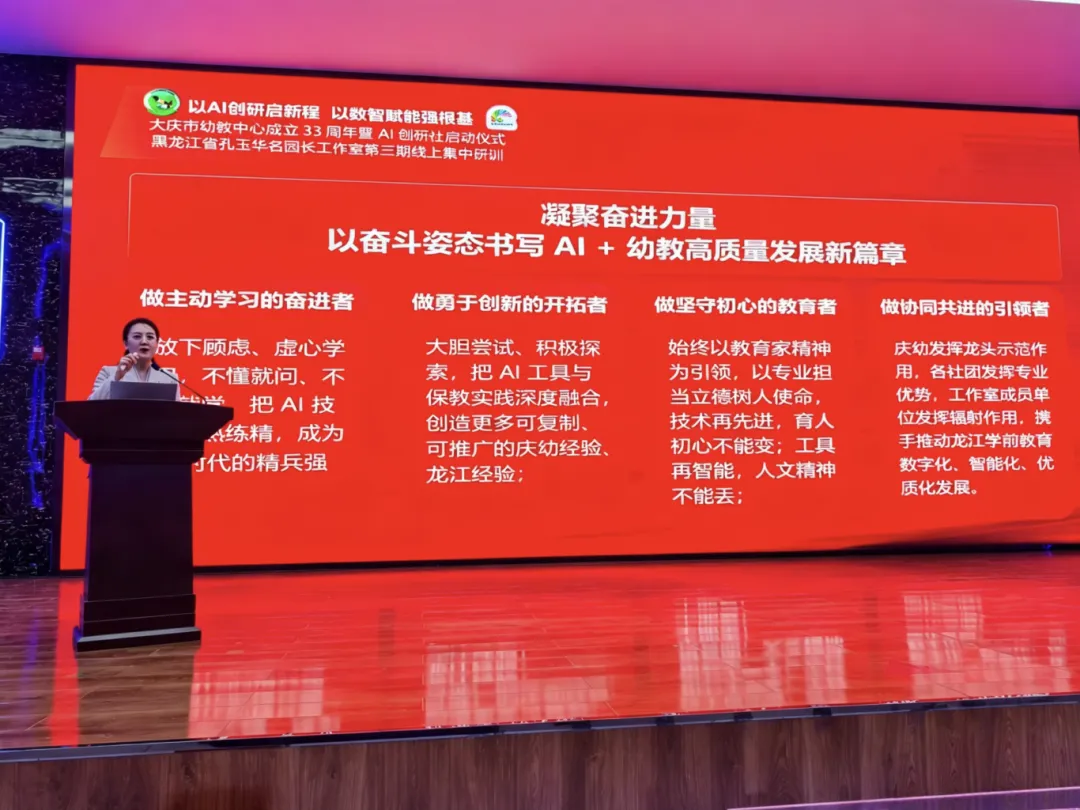 大庆市幼教中心党委书记、黑龙江省孔玉华名园长工作室主持人孔玉华,以“以AI创研启新程 以数智赋能强根基”为题,开展AI创研社成立专题讲座暨省名园长工作室线上集中研训。讲座立足国家战略、行业趋势与庆幼实践,围绕提高政治站位、坚守育人初心、明确目标任务、凝聚奋进力量四大维度,进行全面动员与深度部署,为AI创研社建设与教育数智化转型指明方向。