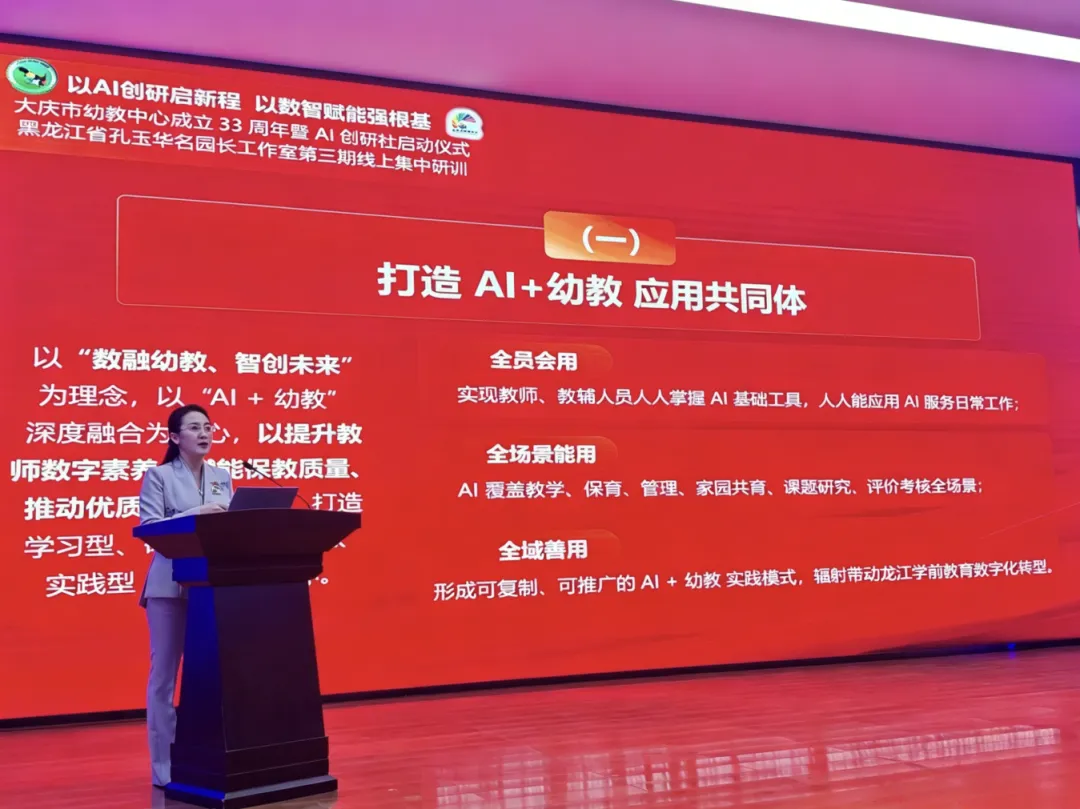 一是打造“AI+幼教”应用共同体,秉持“数融幼教、智赋未来”理念,紧扣AI与幼教深度融合核心,以提升教师数字素养、赋能保教质量、推动优质普惠为目标,全力构建学习、研究、创新、实践于一体的应用共同体,全力实现全员会用、全场景能用、全域善用三大目标,让AI工具覆盖教学、保育、管理、家园共育等全流程,打造可复制、可推广的实践模式,助力龙江学前教育数字化转型。