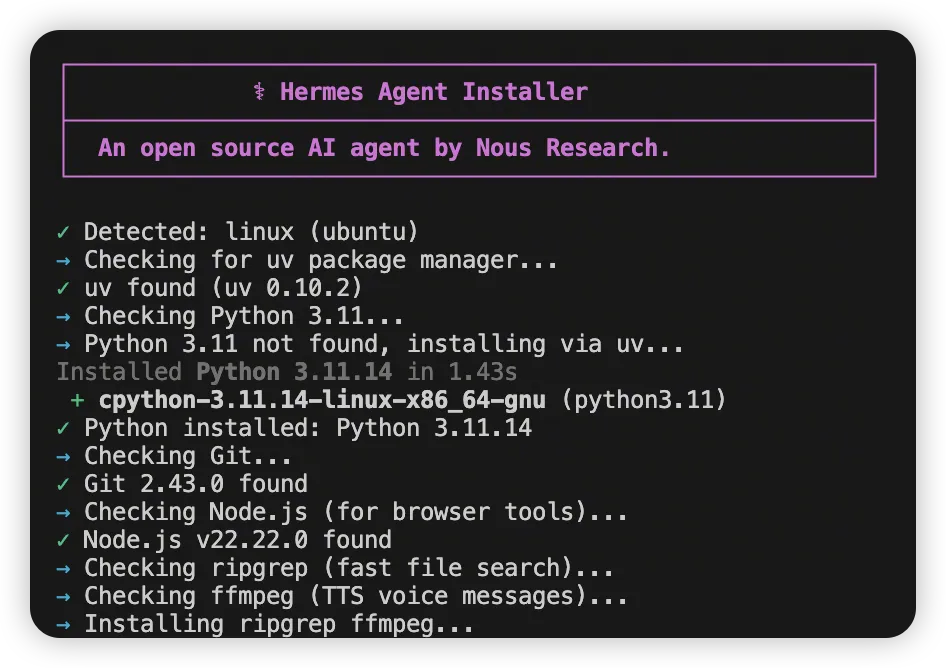 curl -fsSL https://raw.githubusercontent.com/NousResearch/hermes-agent/main/scripts/install.sh | bash