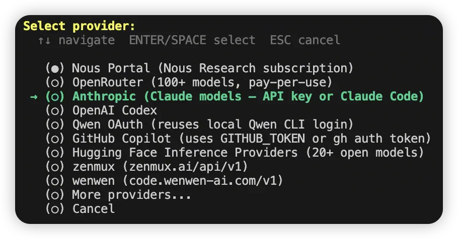 Nous Portal OpenRouter(200+ 模型) z.ai / GLM Kimi / Moonshot MiniMax OpenAI Anthropic 自建 endpoint