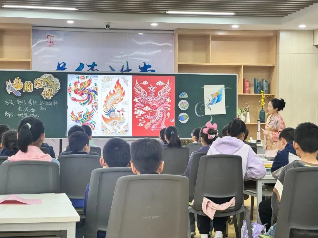 首先由钟楼区第二实验小学蒋妍老师执教四年级《鸟的纹样》一课,她以“爱鸟周”文创设计为任务驱动,引导学生探究凤、孔雀、鹤等经典鸟纹的设计密码。通过观察历代服饰布局、AI生成验证、动手拼摆华服等环节,学生掌握了夸张、对称等纹样方法,感受了传统汉服的布局之美。