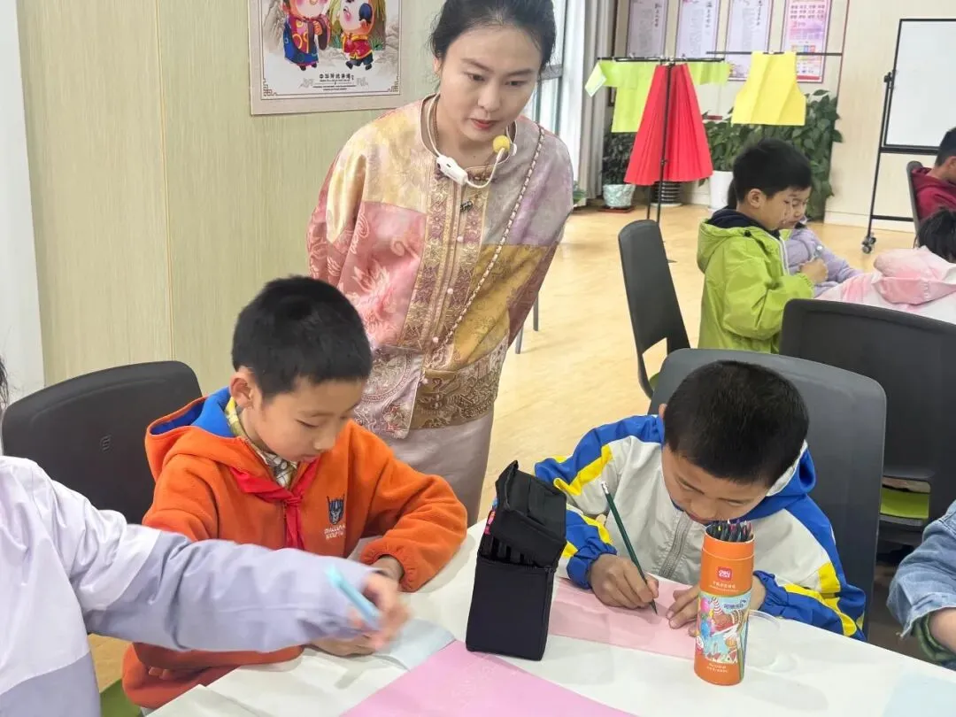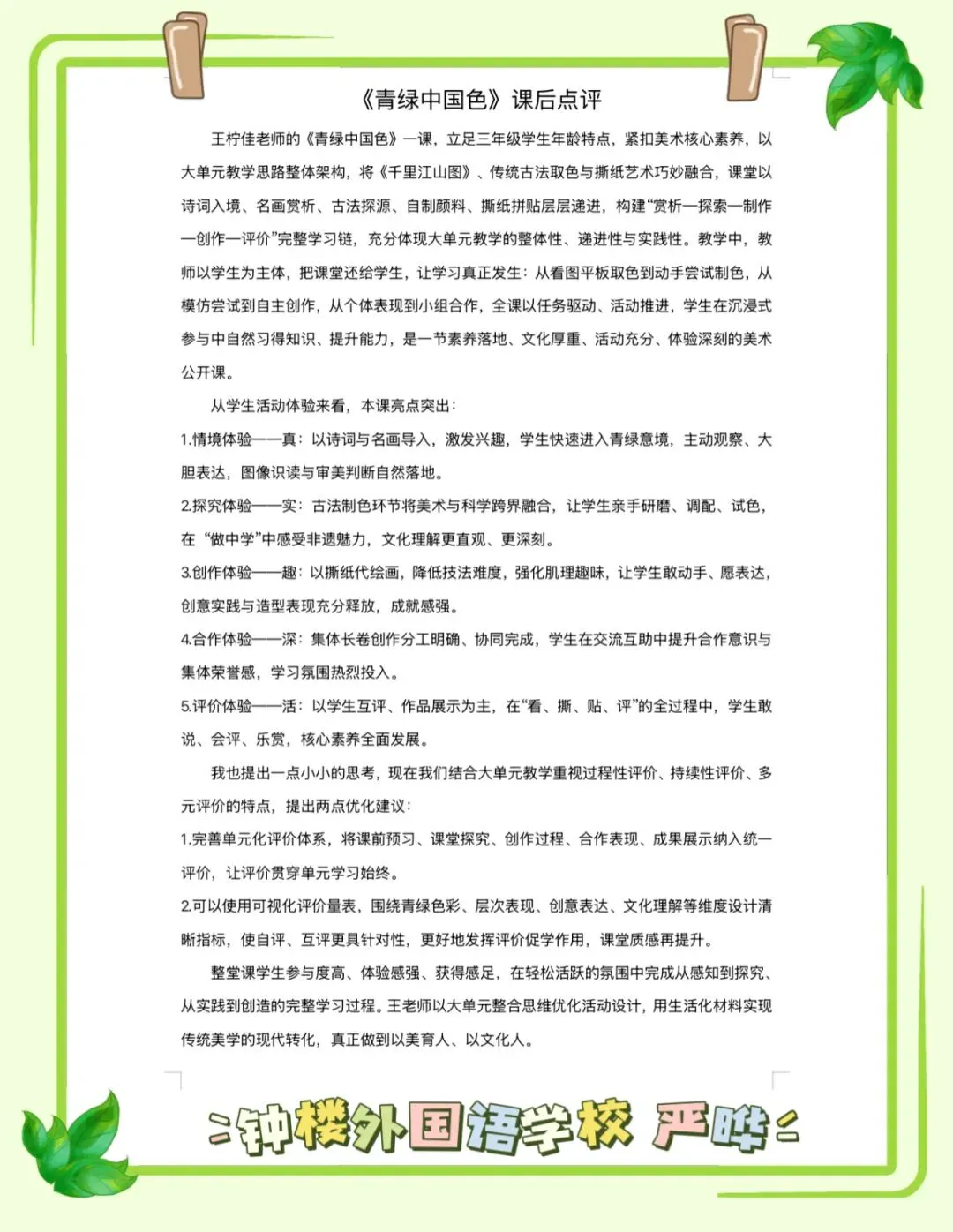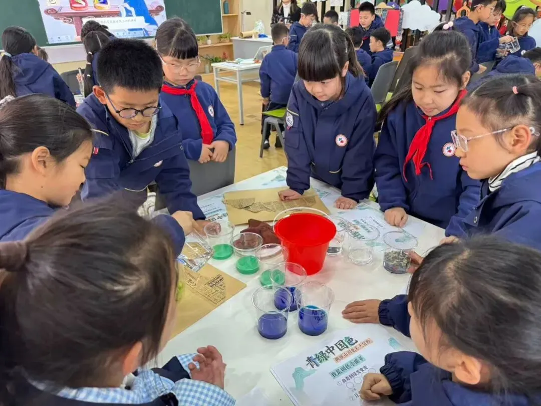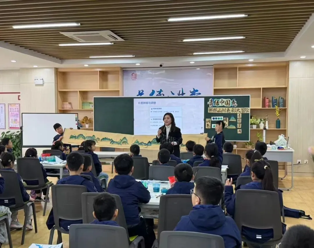 第二节课是钟楼外国语学校王柠佳老师执教三年级《青绿中国色》。王老师带领学生探寻《千里江山图》中的传统青绿之色。孩子们化身小小寻色师,提取石青、石绿,亲手调制颜料,在色彩渐变与深浅变化中体会丹青妙法。学生在撕纸造山、青绿晕染中合作完成千里江山长卷,感受中华传统色彩的千年韵味。