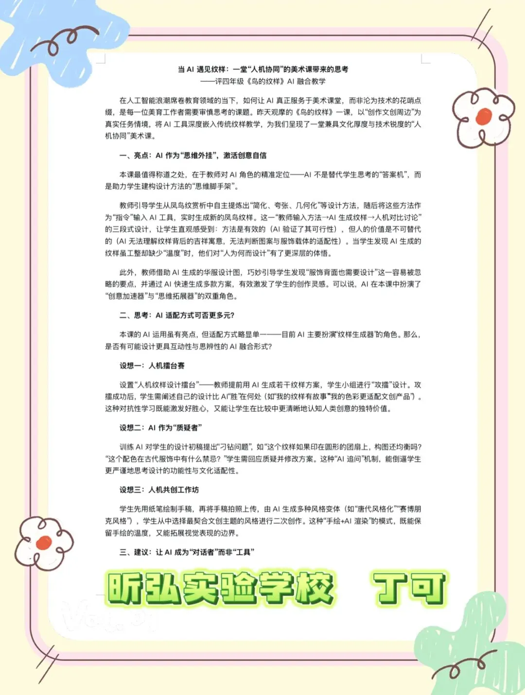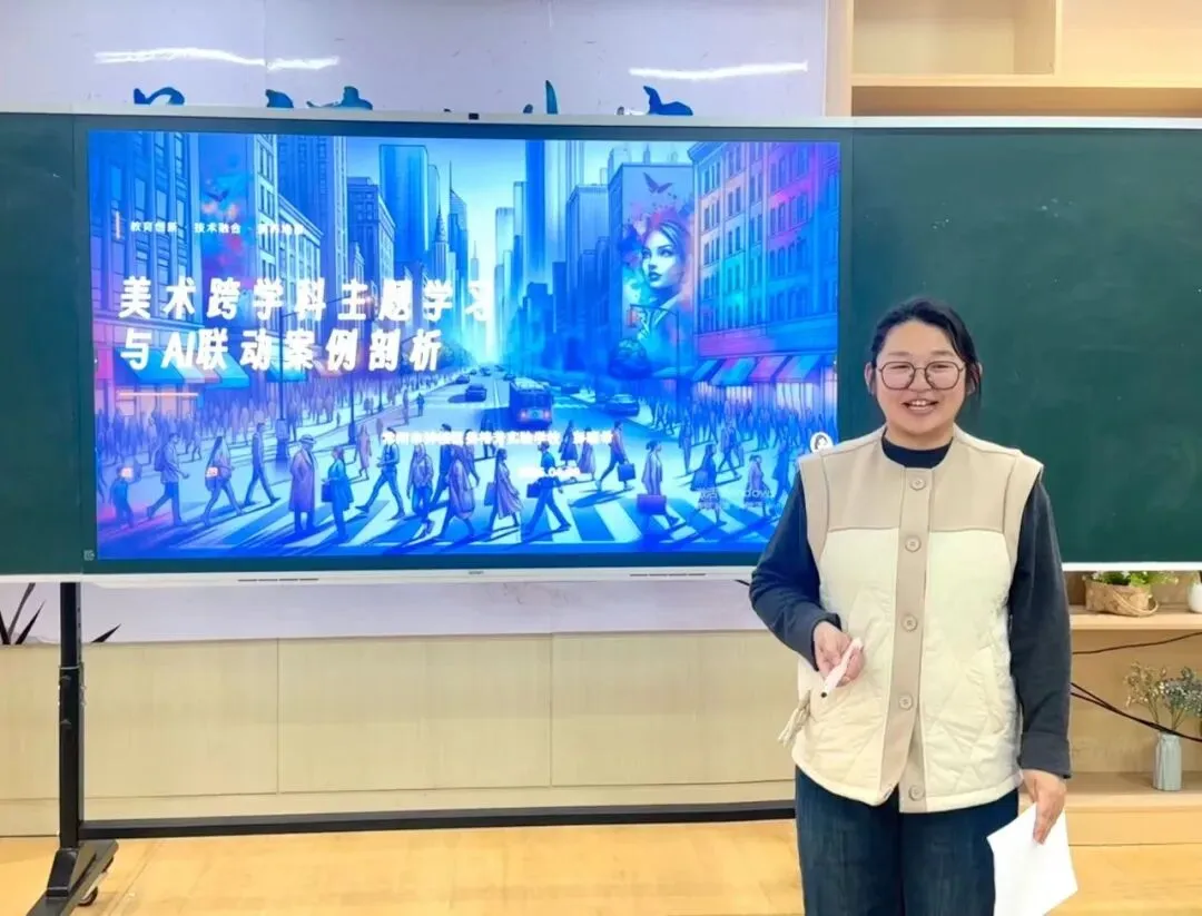 两堂课结束后,常州市钟楼区姜椿芳实验学校彭晓希老师带来了专题讲座《美术跨学科主题学习与AI联动案例剖析》。彭老师从AI辅助教学设计、资源生成、创意拓展等维度,分享了AI技术破解跨学科教学难点、提升课堂效率的具体策略,为一线教师提供了可借鉴的实践范式。