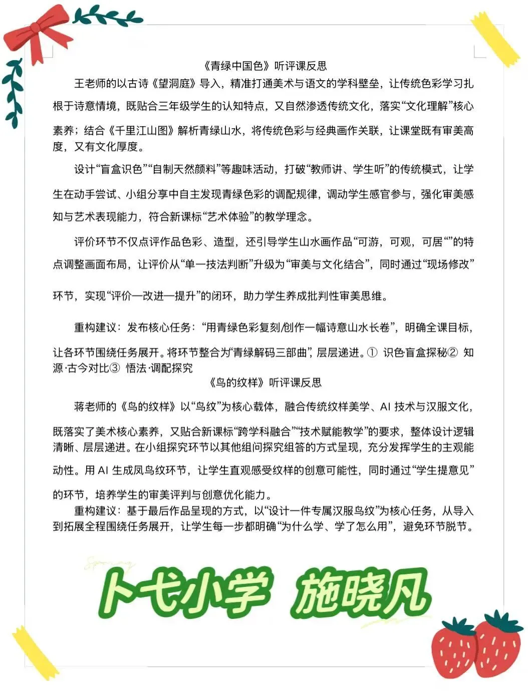 最后,区美术研训员金燮玫老师充分肯定三位老师对AI技术与美术教学的深度融合的思考实践。同时与教师们共勉,提出“三个看”:向前看,明方向。要求教师主动研读理论,把握美育改革脉搏;向外看,拓视野。鼓励教师打破校际与片区壁垒,广泛吸收跨学科、跨领域的先进理念与技术;向内看,强根基。引导教师夯实教学基本功,实现个人专业成长。