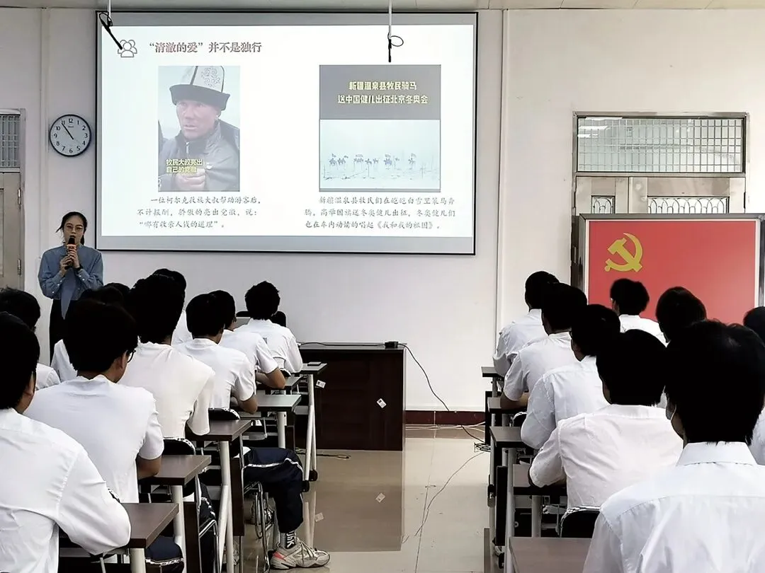 团课伊始,曾一灵老师动容地讲述陈祥榕烈士用生命捍卫自己对祖国“清澈的爱,只为中国”的告白,佐以今年新疆“党徽大叔”、温泉县牧民骑马送奥运健儿出征的案例,带领大家感受人们心中清澈无畏的爱国主义精神。