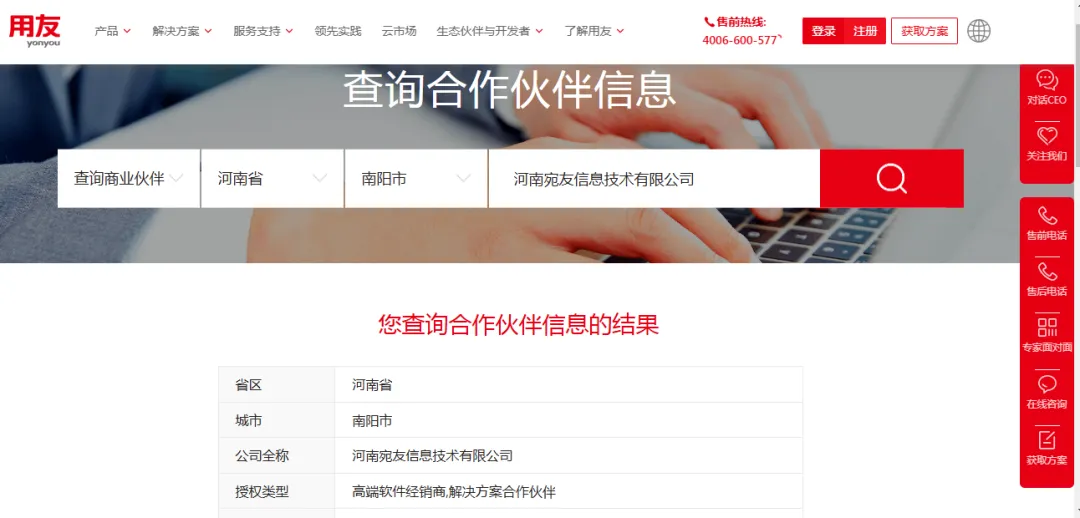 1. 官方查询:登录用友官网,进入“生态伙伴-查询合作伙伴”板块,选择河南-南阳/信阳,输入公司全称,即可核实是否为用友官方授权的正规伙伴。