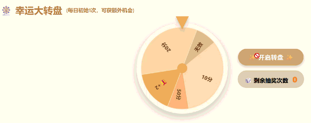 每日初始 1 次抽奖机会,可获得 10/20/50 积分, 运气好还能“再来两次”!