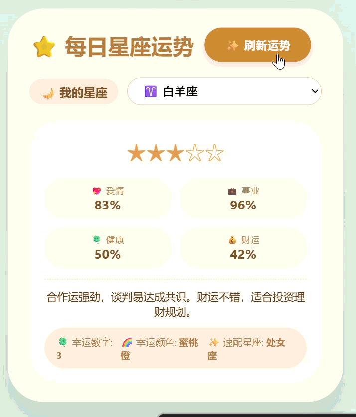 “在不断地调试中我的想法越来越多:要不再加个星座运势?游戏玩久了会不会无聊?有什么方法让用户愿意继续玩?还能加什么?怎么做抓大鹅式消除游戏?怎么用 Canvas 画转盘?怎么让桌面小动物在页面右下角弹跳?每一次提问,AI 都能给我一个可用的方案。我做的,就是把这些方案串联起来,形成一个完整的生态。”