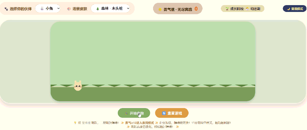 4种动物伙伴:小猫/小狗/小羊/小兔;3种场景皮肤:森林木头桩 / 雪地雪球 / 星空星星;二段跳机制:跳跃手感更流畅;动态难度:15分前简单模式,之后逐渐加速;夜间模式:12分后积分双倍,画面变深色星空;成长系统:幼崽期 → 成长期 → 完全体