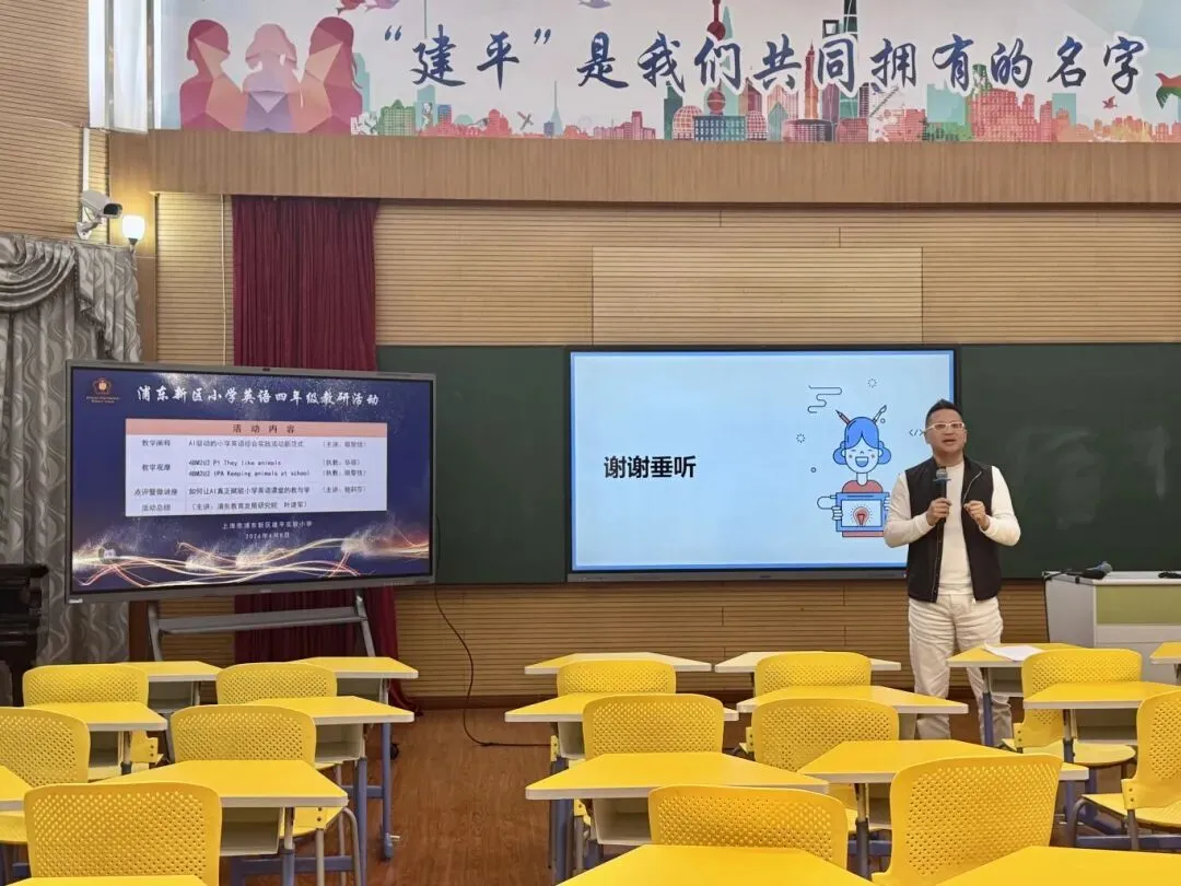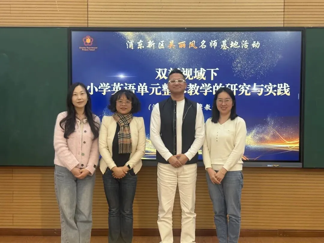 2026 年 4 月 8 日,浦东新区吴丽凤英语学科名师基地部分学员参与了在上海市浦东新区建平实验小学(枣庄校区)举行的小学英语“双新视域下小学英语单元整体教学的研究与实践”教学研讨活动。浦东新区教研员叶建军老师莅临指导,叶建军名师基地成员、钱宏毅老师基地学员、四年级英语教师代表、建平实验小学英语教研组教师齐聚一堂,以单元整体教学为基石,以AI技术赋能为亮点,通过教学阐释、课堂展示、微讲座、专家点评等形式,共同探索小学英语核心素养落地的新路径,展现了学校英语教学的创新实践与专业风采。