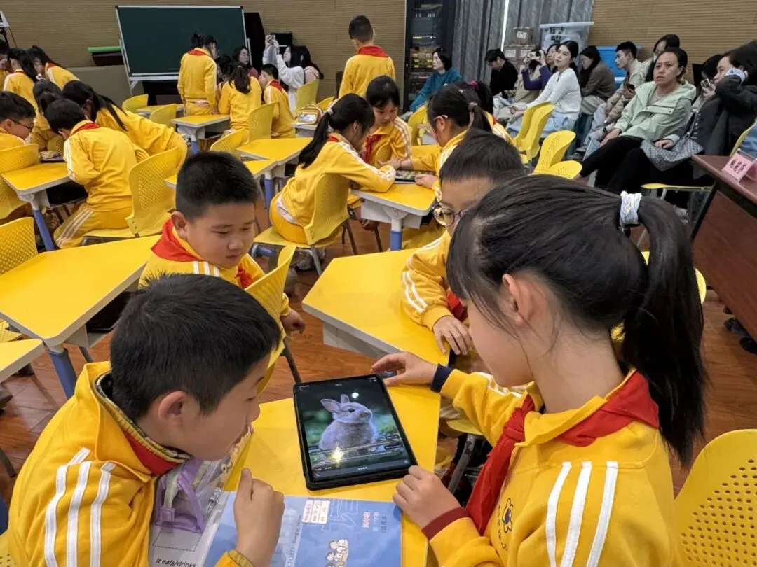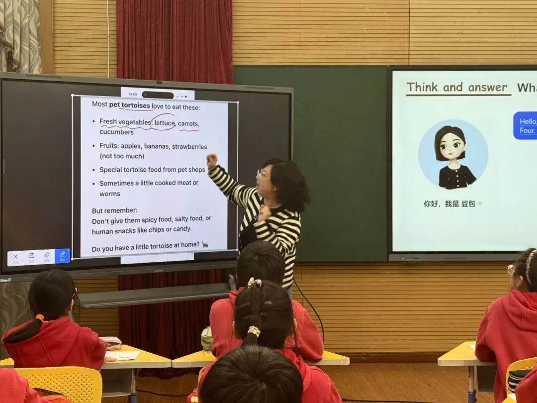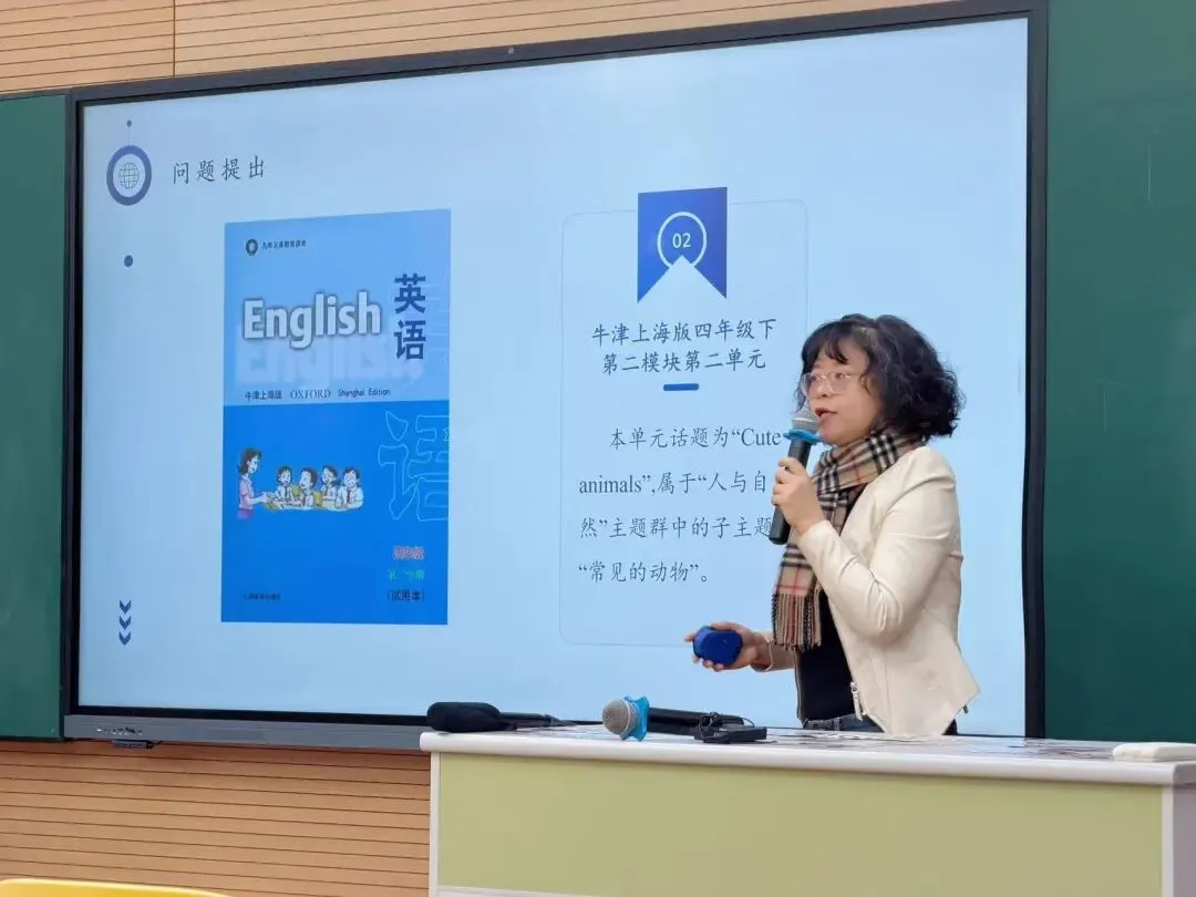 教学展示环节,两位教师呈现了两节4B Module 2 Unit 2聚焦AI赋能的优秀课例。华菲老师执教的第一课时词汇新授课,紧扣单元主题“Cute animals”,以情境、歌谣为载体,清晰搭建的教学环节。课堂聚焦parrot、tortoise、bone、cat food 等核心词汇与 What does…(do)? 关键句型,由扶到放、层层递进。教学中巧妙融入AI 技术辅助信息查询与文本整合,助力学生快速感知鹦鹉、乌龟的食性特点。学生在轻松氛围中感知词汇、运用句型,充分感受动物的可爱,激发英语学习与关爱生命的热情。