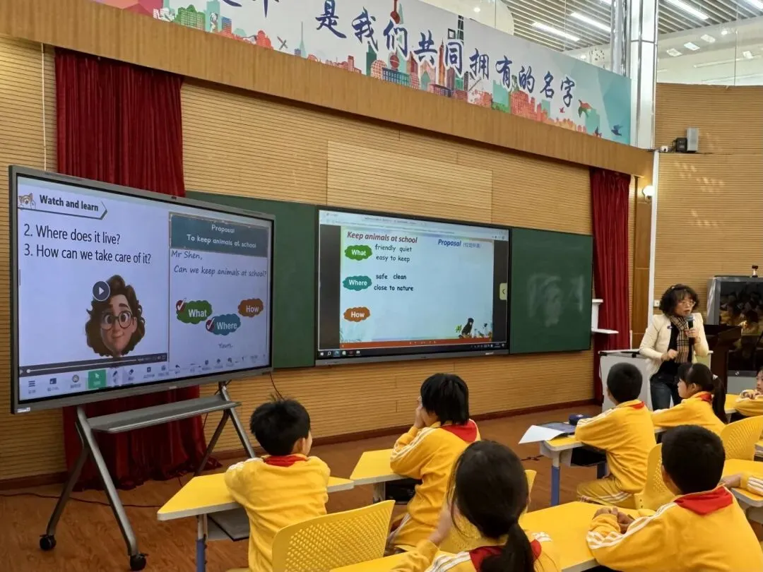 而顾黎佳老师执教第五课时,以IPA综合实践课的形式进行,以“饲养校宠计划书”为真实驱动任务,创新融合AI智能体辅助教学。课堂围绕动物选择、饲养地点、日常照料等真实问题展开,引导学生借助 AI 查询信息、小组合作完成提案,运用 We want to keep…、It eats… 等句型进行汇报展示。课堂张弛有度、情境真实,学生在解决实际问题中综合运用语言,深化“人与动物和谐共处”的意识,实现学用结合、知行合一。