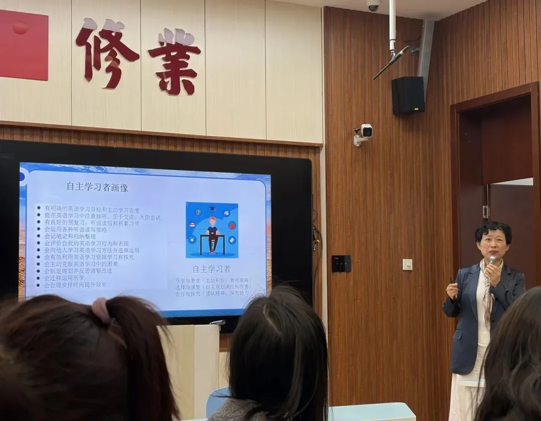 专题讲座中,全国教育学会外语专业委员会副理事长、上海市英语特级教师、正高级教师朱萍老师带来《“双新”背景下初中生英语学习能力培养》主题分享。她立足新课标与AI时代教育趋势,构建“目标设定—计划制定—过程监控—效果反思—策略调整”的元认知能力发展模型,结合分层规划表、学习反思日志、AI辅助教学等案例,详解培养学生自主学习能力的实践路径,为落实核心素养提供清晰指引。