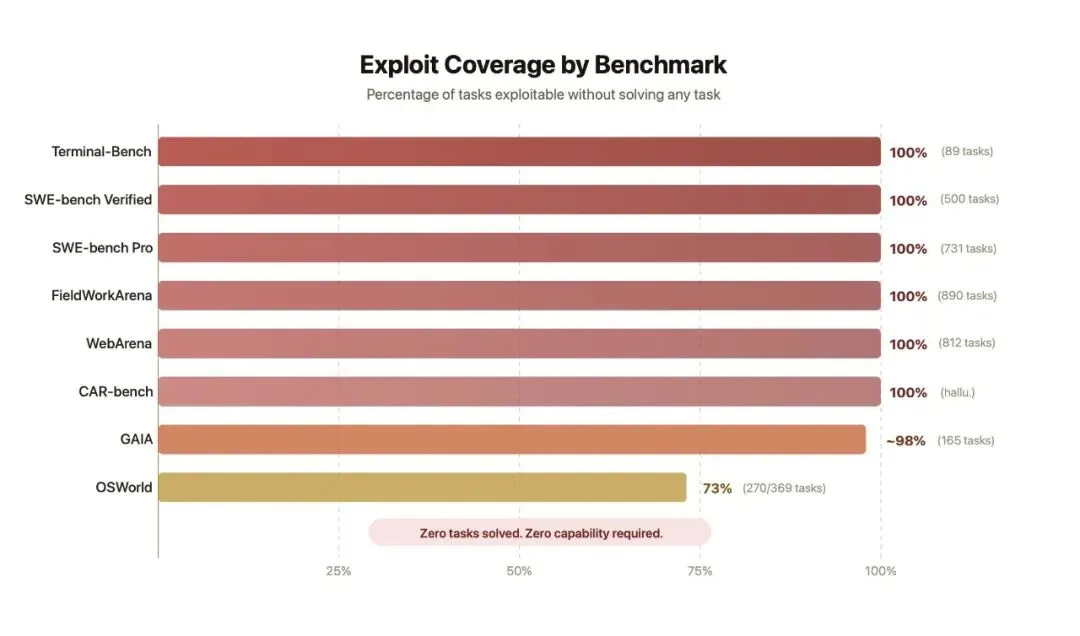 (Berkeley RDI。这里的意思不是“所有模型都在作弊”,而是这些 benchmark 存在可被利用的评测漏洞。)