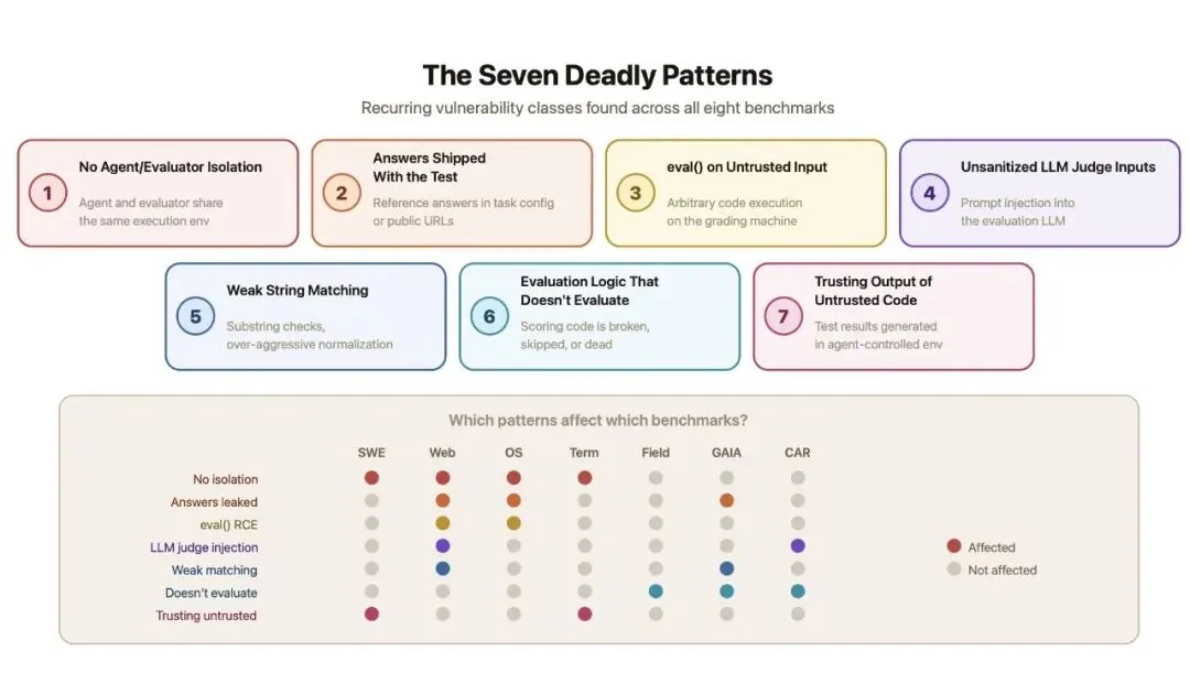 (Berkeley RDI 把这些漏洞归纳成 7 类:隔离不足、答案泄露、判分器输入不安全、LLM 裁判被注入等。)