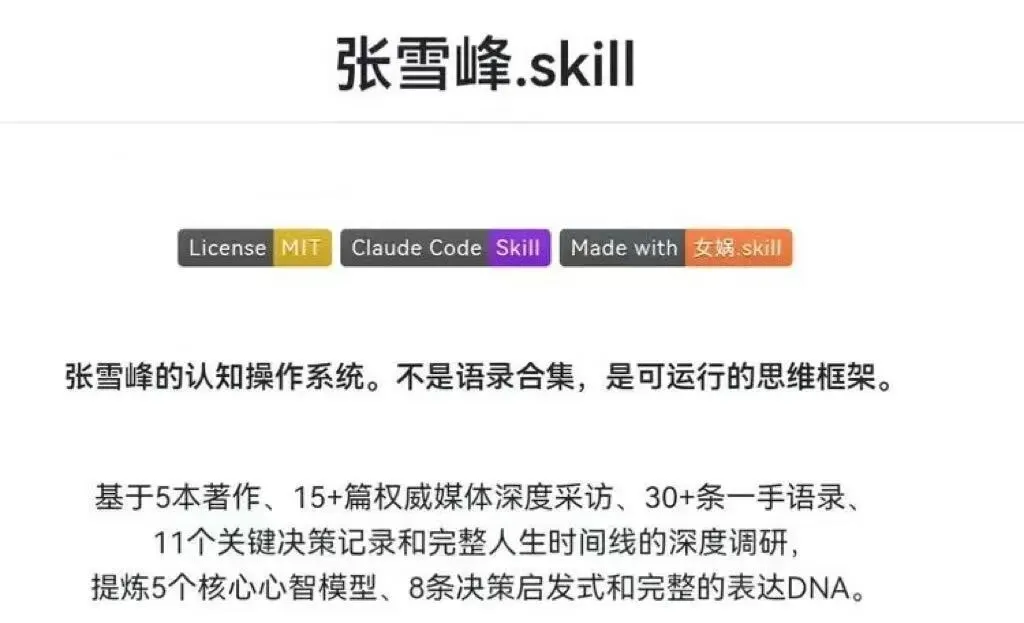 根据该技能包网页介绍,开发者基于5本著作、15篇权威媒体深度采访、30多条一手语录、11个关键决策记录和完整的人生时间线深度调研,提炼出5个核心心智模型、8条决策启发式和完整的“表达DNA”。该项目强调,其每段回应不是复读语录,而是使用张雪峰的认知框架分析问题。