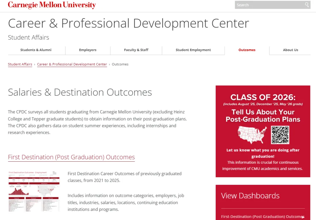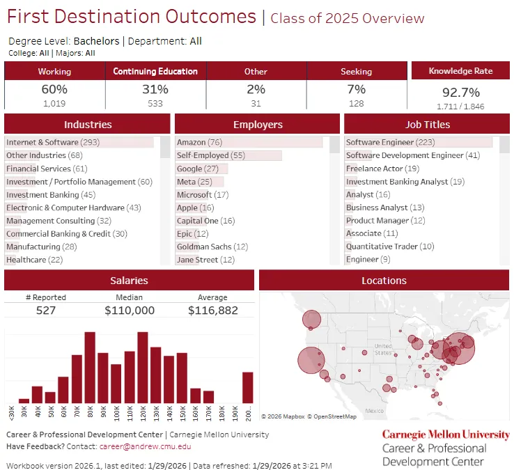 CMU 官方职业结果显示,学校会持续追踪 2021 到 2025 届毕业生的第一去向,数据里包含就业、继续深造、薪资、企业和地区分布;2025 届本科整体来看,毕业 6 个月内 91% 的学生已经就业(60%)或继续读研(31%),学校官方给出的 2025 届本科平均起薪是 116,882 美元。这不是单纯“名校光环”,而是实打实的回报率。