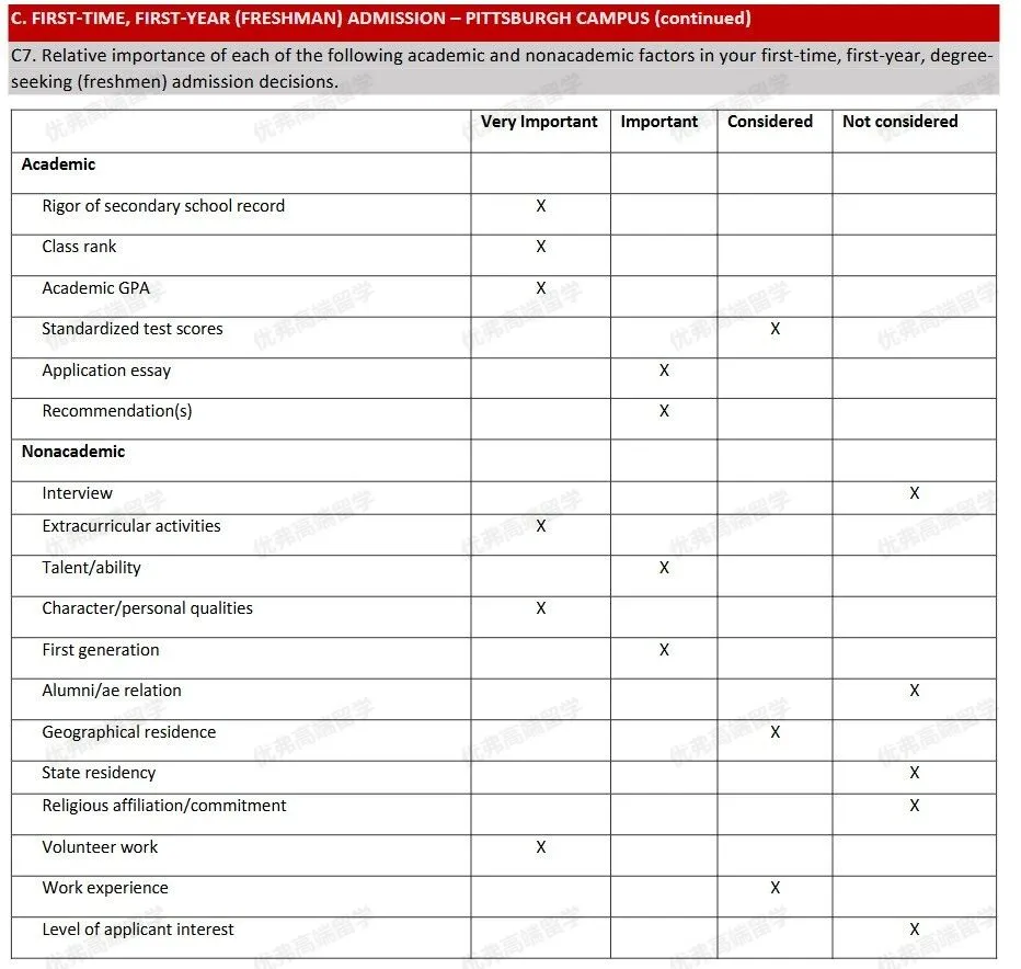 CMU 不是“随便看一下分数”的学校,Common Data Set 明确写着:高中课程严谨性、班级排名、GPA、标化成绩、申请文书、推荐信都很重要,课外活动、天赋/能力、性格和个人品质、第一代大学生身份也会被纳入考察。