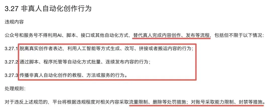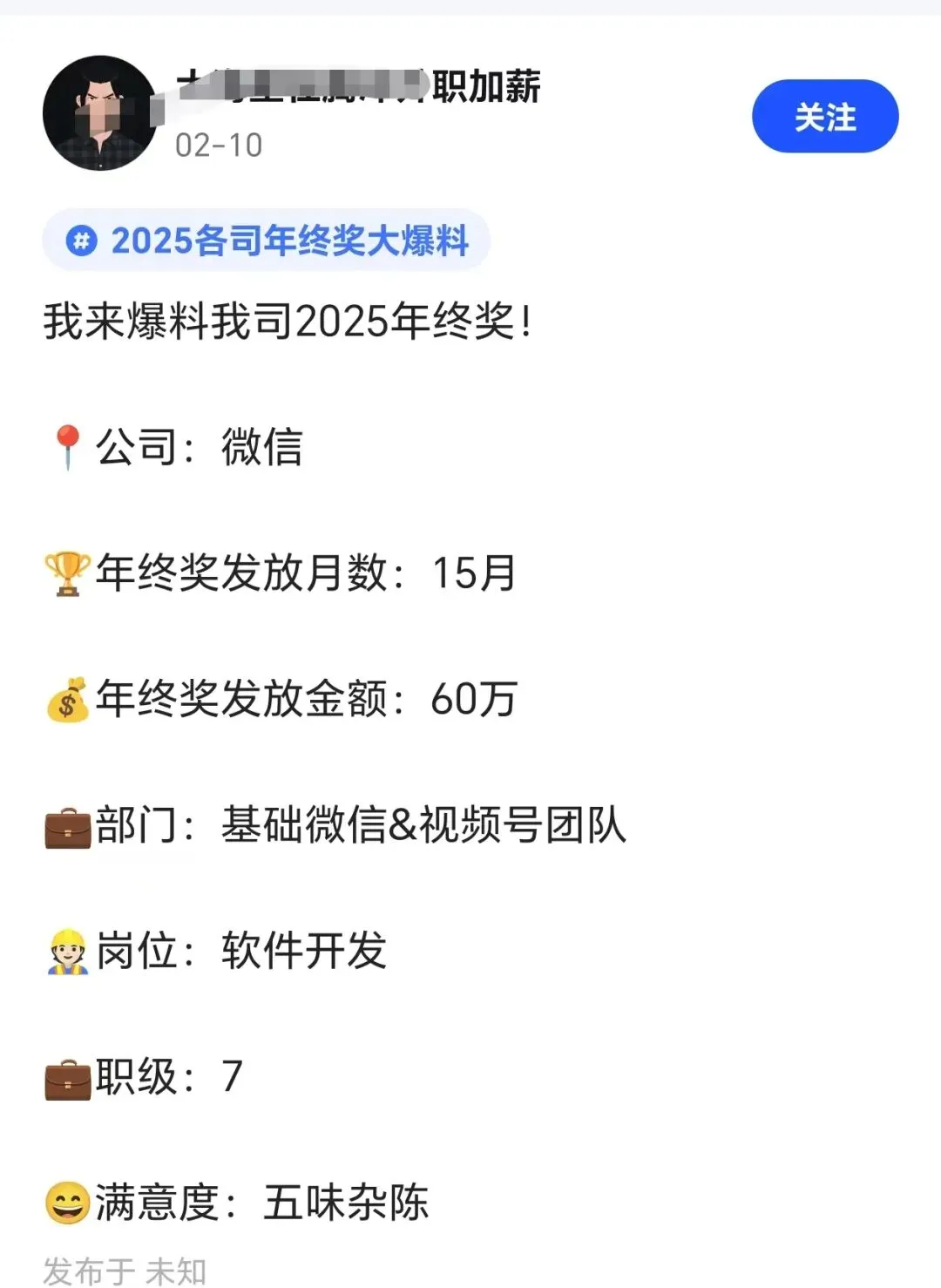 微信25年年终奖到账,软件开发岗,60W(15个月工资).微信公众号严打非真人AI创作近日,一位在腾讯基础微信&视频号团队的软件开发发岗员工,在某职场社区曝光了其25年年终奖,总包达60W,相当于15个月工资。15个月工资,60W,倒推其月薪大约4W,全年税前总收入高达108W。一个开发岗,年入百万,妥妥打败了99%的人。年终奖比平时工资还多,难怪人家能撒了欢、卖了命的干,人家这一年干到头,是有盼头的。而我们更多的普通打工人,一眼就能望到头,是从年初硬往年底熬。当然,这么高的收入,他肯定是要缴不少的个税的。根据个人情况不同,免税扣除情况不同,他要缴纳的个税大概在21~23W之间。很多人正式工资可能还没他缴的税多。扣除五险一金和个税后,该员工全年实际到手收入在74W ~76W之间。提起微信,不得不提这几天围绕微信公众号的两个热点:一个是说,有一对夫妇在接受网络访谈时,自曝用AI写公众号一年赚了200万。一石激起千层浪,引得大家那个羡慕嫉妒恨啊。用AI,不用脑、不动手,哗哗堆内容,一年赚200W?这不等于捡钱吗?新闻一出,大家除了羡慕,也都开始摩拳擦掌,准备复制别人夫妇俩的AI成功之路。结果,就在大多数人账号还没注册好的时候,微信闻风而动,直接封了这对用AI赚200万夫妇的微信公众号。并更新发布了微信公众号运营规范,大规模打击非真人AI创作行为。这便又造就了围绕微信公众号的第二个热搜。所谓打击“非真人AI创作行为”的要求,是指微信公众号运营规范新增加的条款2.7的内容。总结起来,要求就三点:第一,严禁非真人AI创作。啥意思呢,就是你不能纯粹就给AI发一个指令让其生成一篇内容,然后原封不动的发布到公众号上。也就是说,平台打击的是全程人都不参与,直接让AI自动生成内容的行为。而如果你只是用AI作为工具,帮你打构思内容大纲、打磨润色语句、校对文字等辅助创作行为则不受此影响。第二,严禁用AI智能体、脚本或自动化工具,代管账号,脱离真人去登录账号、发布内容。这个好理解,和非真人AI创作,一脉相承,就是不允许用技术手段,直接脱离真人运营公众号。第三,严禁传播涉及上述两条违规行为的教程。既然非真人AI创作、自动化发文是违规的,那教别人这么做的内容,也是不被允许的。微信公众平台,同时制定了处罚措施,一旦违反上述三项规定,相关内容将被限流或删除,涉事账号则会被限制能力或封号。围观吃瓜之余,有两点感慨:第一,200万夫妇玩脱了,偷鸡不成蚀把米。他们造这个热点,其实是为了让别人追捧他们,买他们的课收割后来者。事实上,事后诸多迹象也表明,他们的200万收入,并不是全是流量收益,很多一部分都是卖课收入。第二,自古以来,都讲求闷声发大财。这等轻轻松松赚200万的好事,你还到处说,让所有人都去给平台造AI垃圾内容,伤害人家庄家利益,人家能忍、能饶你?所以啊,虎口里夺食,要悄悄的进行,打枪的不要。共勉!