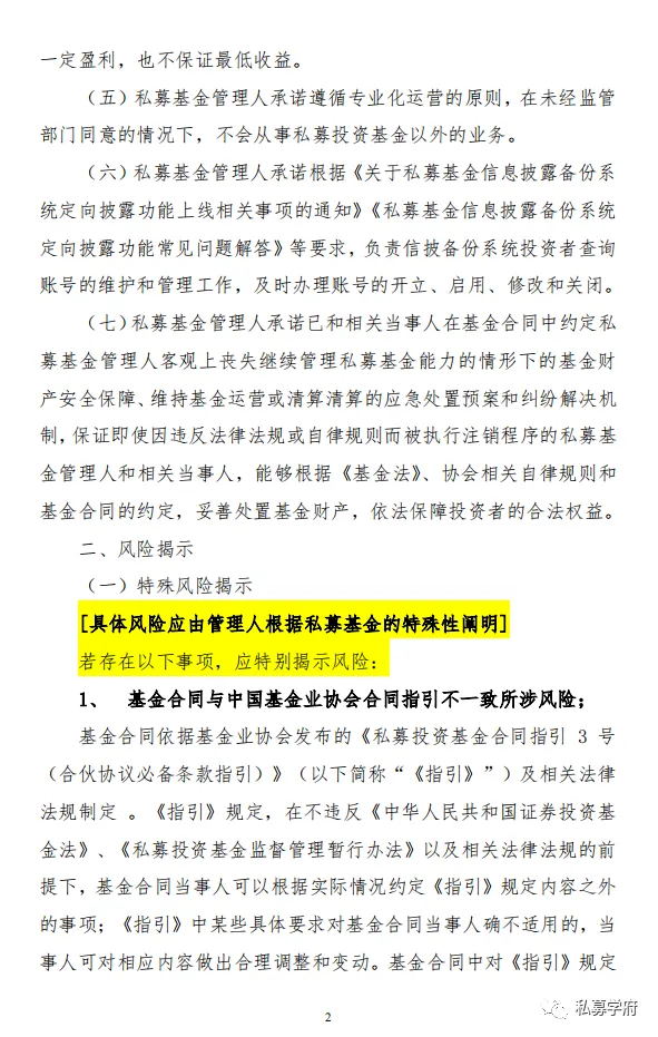 中基协于2023年2月24日发布了《私募投资基金登记备案办法》中,对风险揭示书“特殊风险揭示”要求如下: