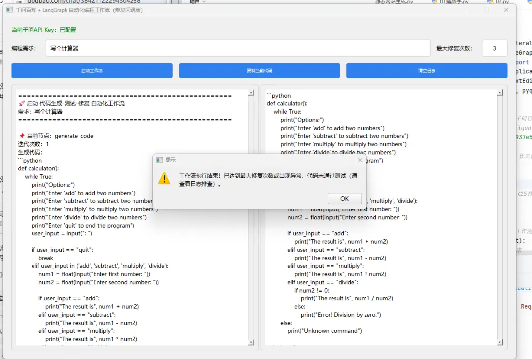 安装依赖: pip install langgraph langchain_community pyqt5 dashscope替换千问API Key为真实密钥。 运行程序,输入编程需求(如:写一个计算器函数)。 设置最大修复次数,点击启动工作流。 查看左侧日志与右侧代码,测试生成代码是否可运行。 复制代码到本地验证执行结果。