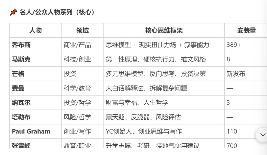 平时你想获得马斯克的视角,你得读他的传记、看他的采访、研究SpaceX的决策逻辑——可能需要几十个小时。但现在,他的核心思维框架已经被提炼成一个可以直接对话的"思维插件"。