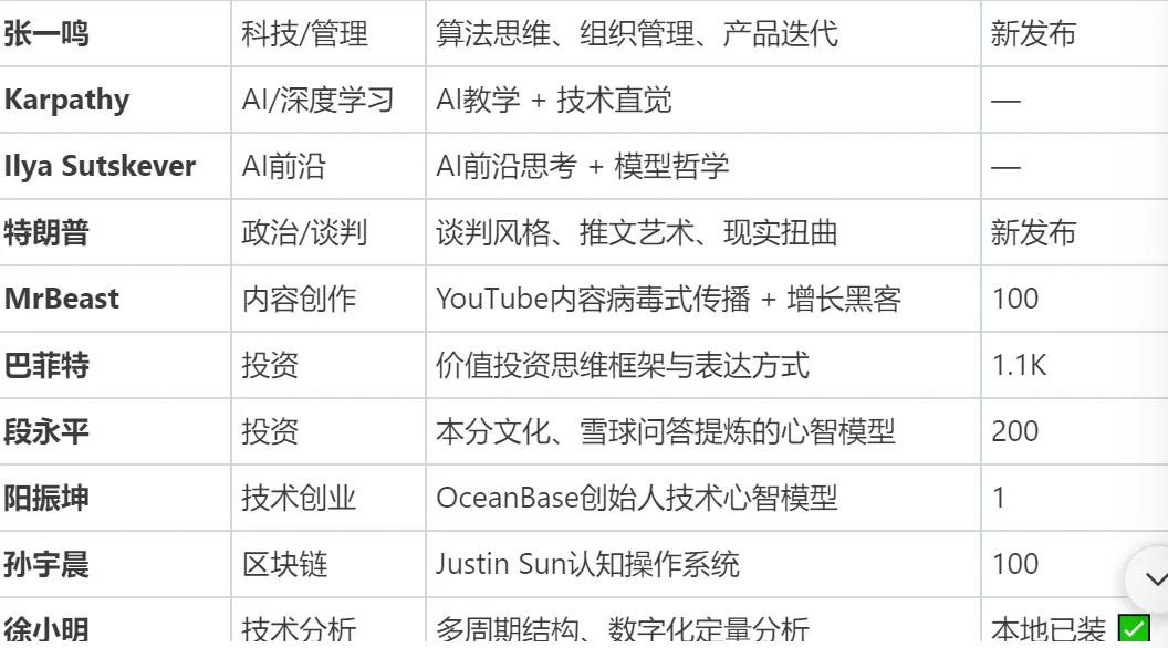 快速对齐 在你还不了解某个人物时,快速获得一个大致准确的认知框架 多角度审视 :同一个问题,分别用四个人的框架看一遍,你会发现盲点 比如现在想分析黄金期货,徐小明提供技术视角。如果加上马斯克的视角("原材料值的多少钱?白痴指数是多少?")和芒格的视角("激励结构是什么?谁在买黄金?为什么?"),结论会丰富得多。