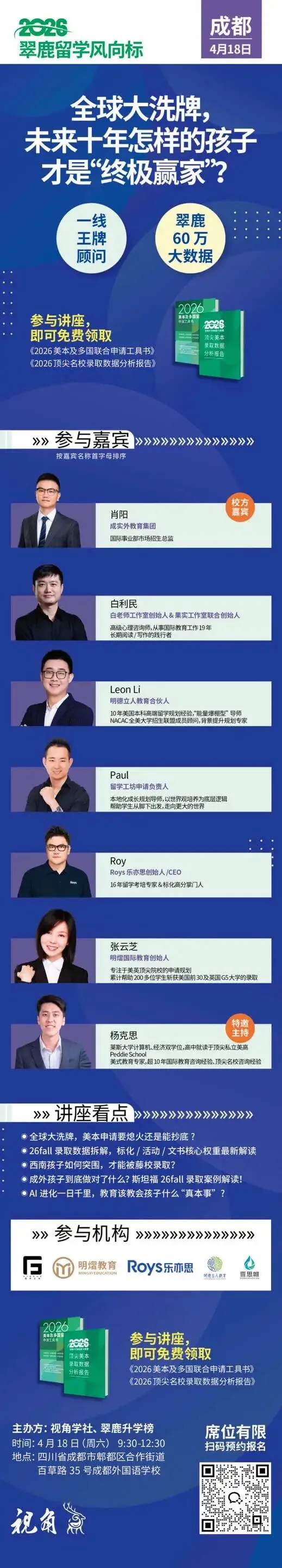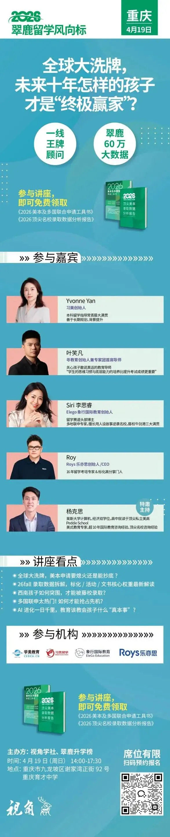 活动预告+录取大数据分析报告 2026翠鹿留学风向标来啦!视角学社联合翠鹿升学榜将在成都(4月18日)、重庆(4月19日)等多城(其余城市时间陆续揭晓中)举办重磅讲座,解析60万录取大数据。参与讲座,即可免费领取最新版《2026顶尖名校录取数据分析报告》。席位有限,尽快报名吧!
