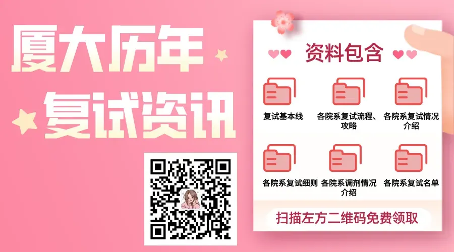 3月份开始厦大各学院的复试通知将会陆续公布!大家记得置顶和星标圆梦厦大哦!我们会第一时间采集推送消息给大家!需要名单或者资料的可加学姐微信:duxiada领取!学姐会备注好统一发送~本文档包含以下复试细则、录取名单等文件,快加我啦!
