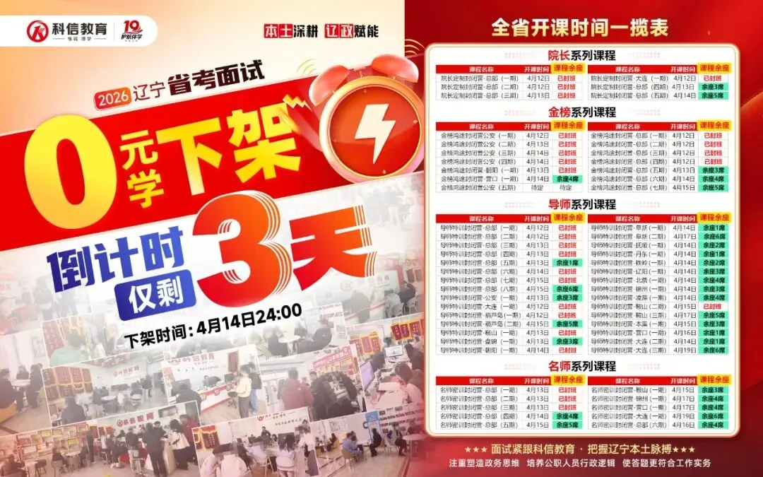 资格复审过了,面试备考刻不容缓!科信教育 2026 辽宁省考面试「0 元学」活动仅剩 3 天!4 月 14 日 24:00 正式下架!
