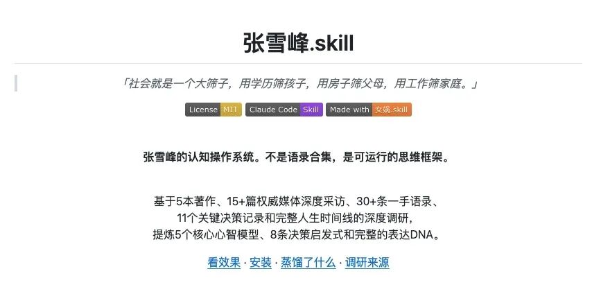 2026年4月,一个名为“张雪峰.skill”的开源项目在GitHub悄然上线,短短数日便引发全网热议。这个项目基于张雪峰生前的5本著作、15篇权威媒体深度采访、30多条一手语录、11个关键决策记录和完整的人生时间线,提炼出5个核心心智模型、8条决策启发式和完整的“表达DNA”,将其打包为一款AI智能体技能文件。