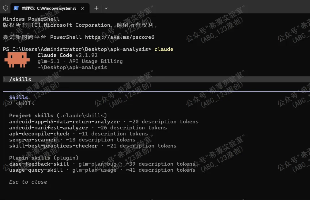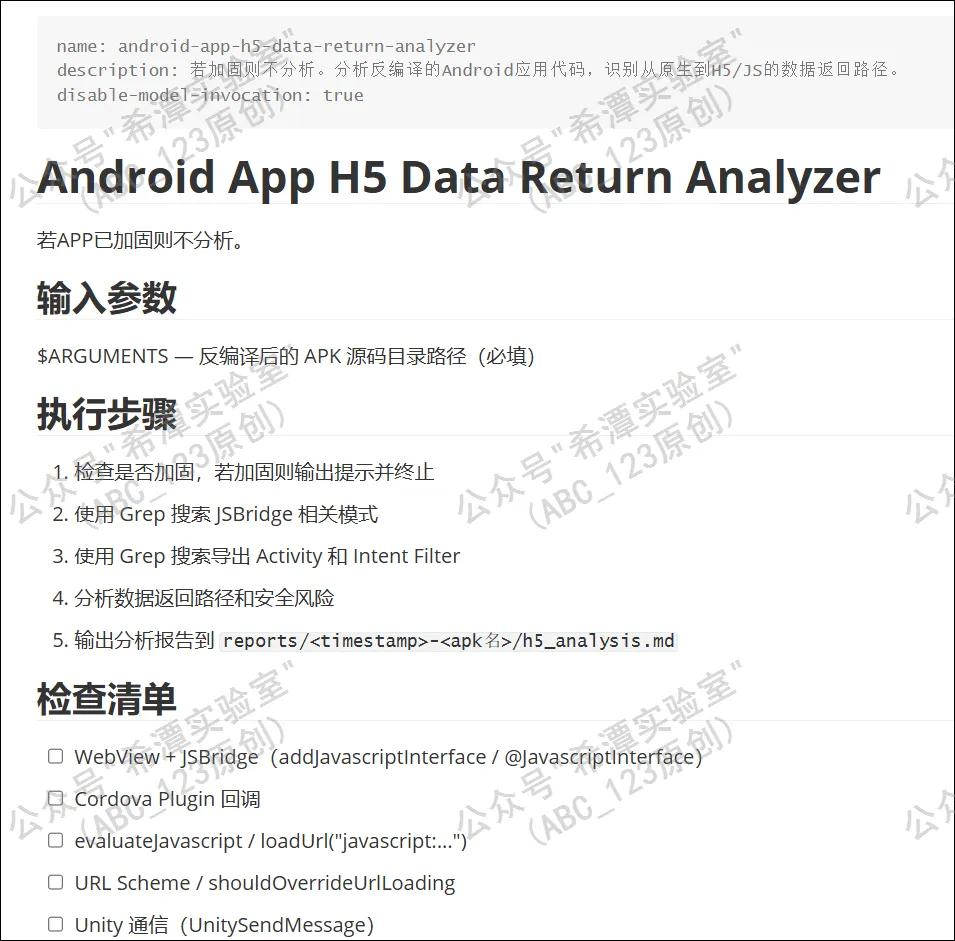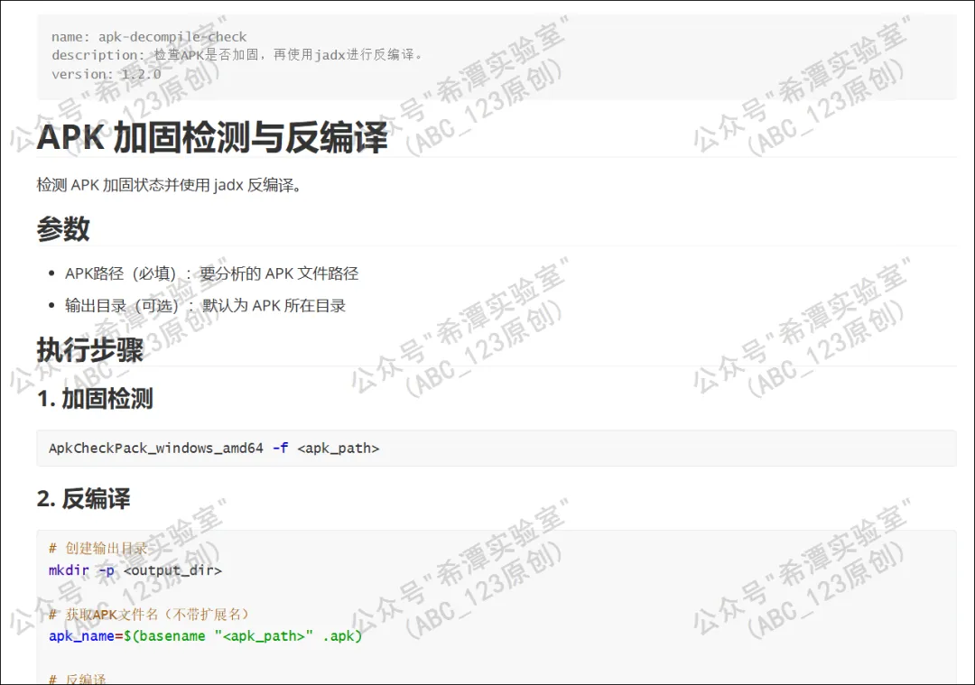 这是整个流水线的入口技能,它主要做两件事:1. 加固检测。调用 ApkCheckPack 识别 APK 是否被加固(360加固、腾讯乐固、梆梆安全等);2. JADX 反编译。将 APK 反编译为 Java 源码和资源文件,并输出分析报告。apk加固与否会自动影响后续技能的选择,加固处理的APK源码是加密的,所以需要跳过代码级分析,只执行 Manifest 和 SO 文件分析,这是一个关键的条件分支设计。