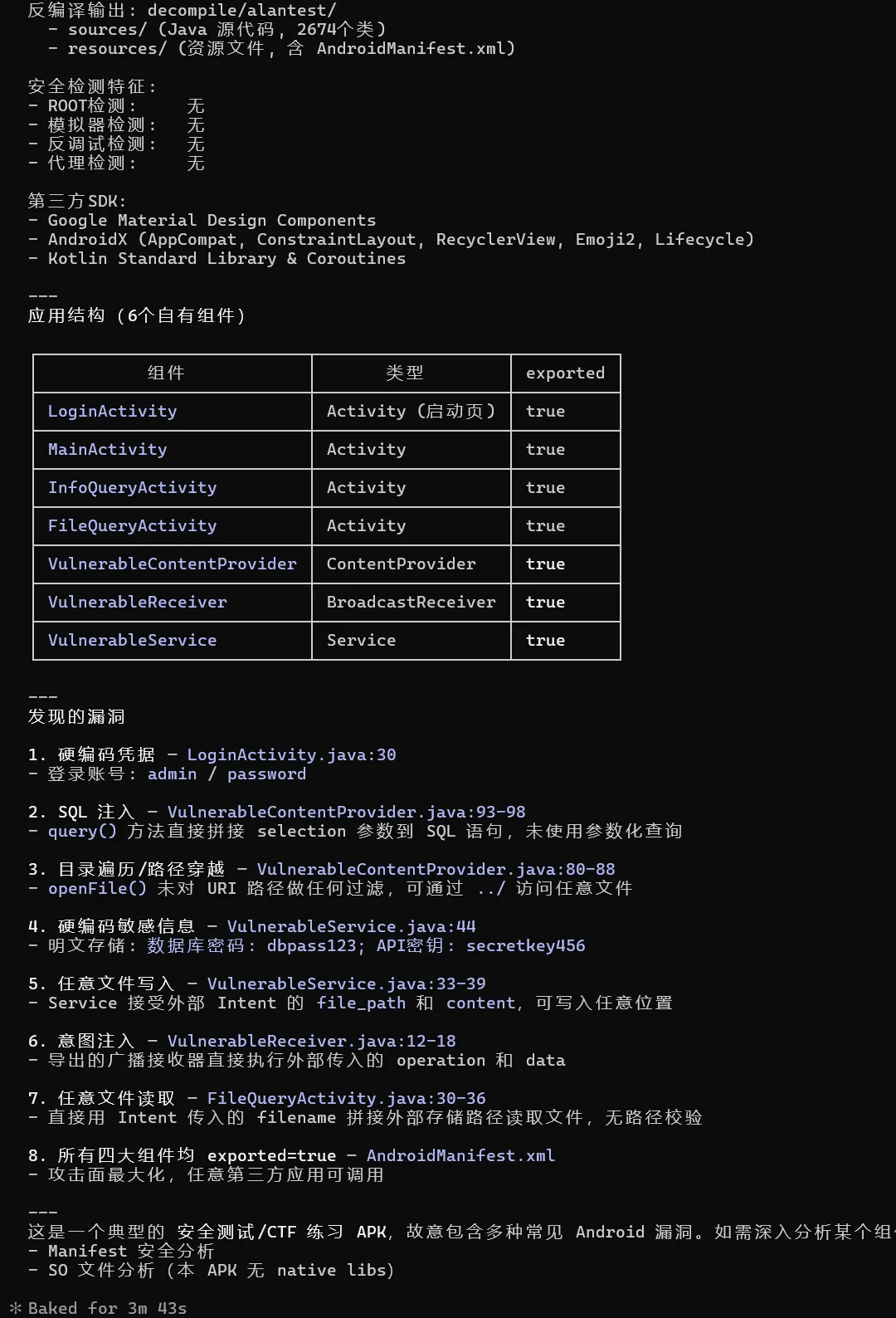 # 1. 反编译(自动检测加固)/skill: apk-decompile-check /path/to/target.apk# 2. 并行安全分析(AI 自动根据加固状态选择)/skill: semgrep-scanner/skill: android-manifest-analyzer/skill: so-analyzer/skill: android-app-h5-data-return-analyzer# 3. 综合报告(AI 自动汇总所有分析结果)