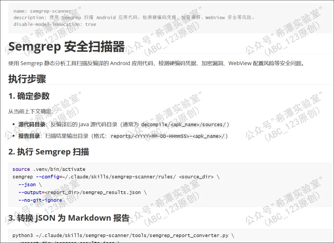 reports/ 目录下获得一份完整的安全评估报告:reports/2026-04-12-143000-target-app/├── semgrep_report.md # 硬编码凭据扫描结果├── manifest_analysis.md # Manifest 安全配置分析├── so_analysis.md # SO 文件敏感信息├── h5_analysis.md # H5/JS 数据通道分析└── comprehensive_analysis.md # 综合安全评估(含风险汇总和修复建议)