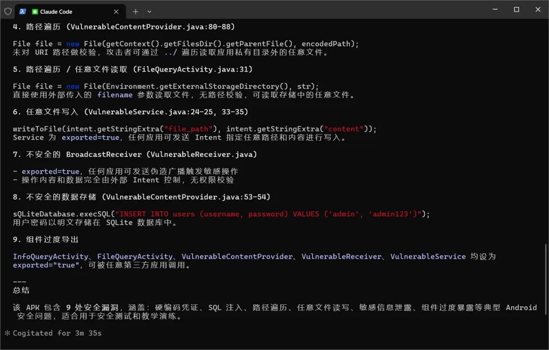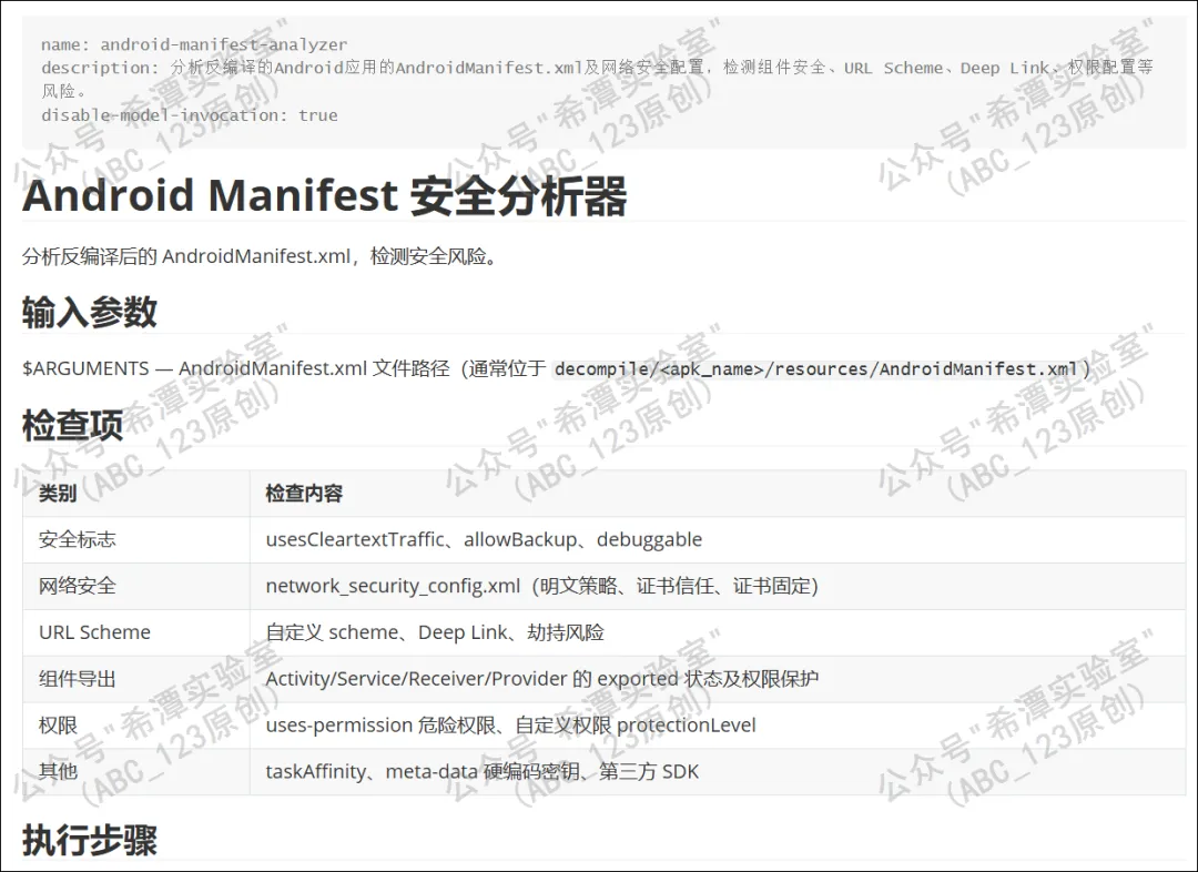 该技能从 Manifest 和网络安全配置中挖掘攻击面,主要检查APK的AndroidManifest.xml 文件。该技能不只是罗列问题,而是标注风险等级并给出修复建议。例如导出 Activity 无权限保护会标记为「高危」。