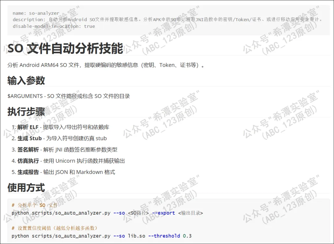 so-analyzer/├── SKILL.md # 精简的执行指令├── references/│ ├── sdk_functions.md # SDK 函数映射表(AI 知识增强)│ ├── so_auto_analyzer.md # SO 分析方法论│ └── example_targets.py # 目标模式示例└── scripts/└── so_auto_analyzer.py # 核心分析脚本