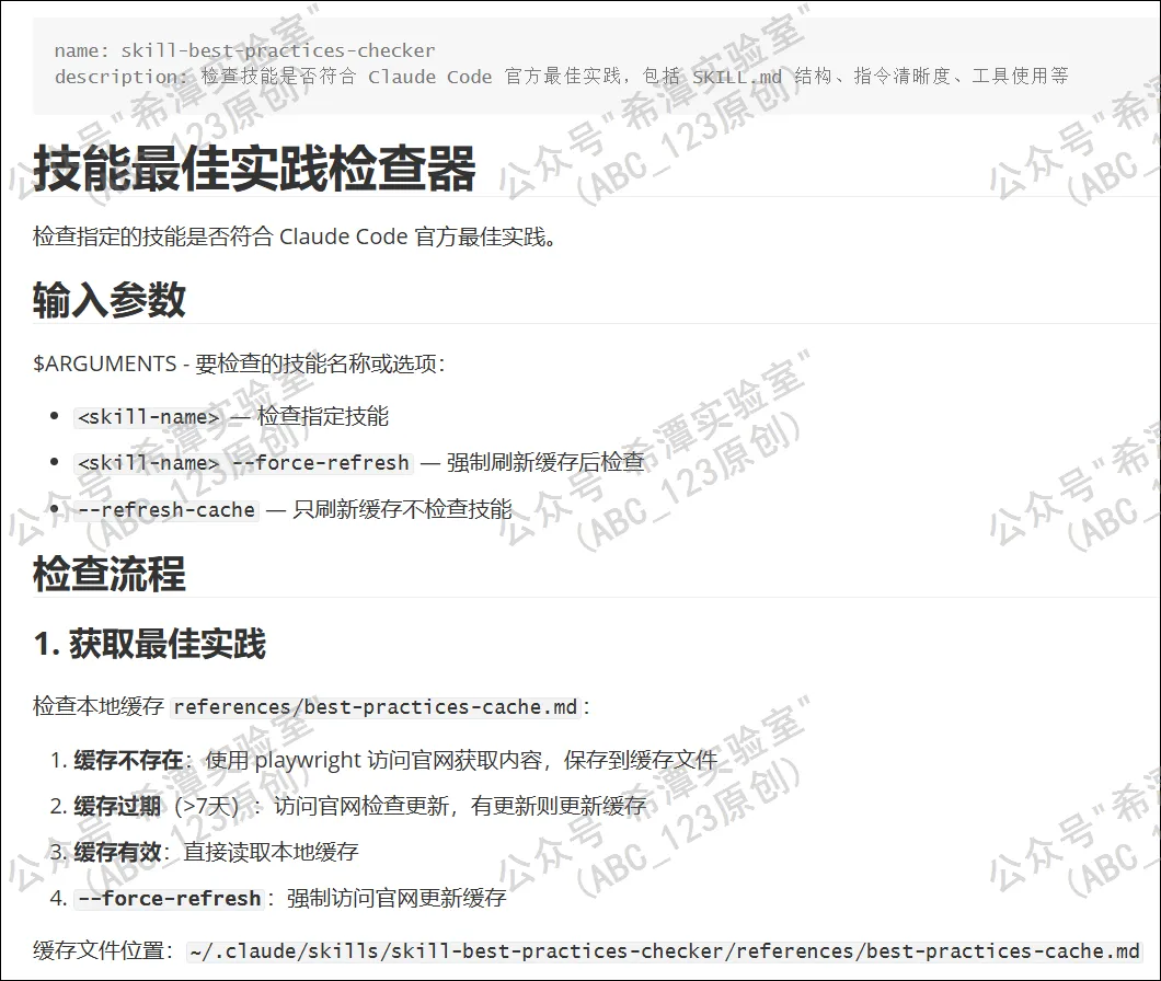 该技能可以去检查技能的执行是否符合预期,输出报告是否能达到质量。它从 Claude Code 官方文档拉取最佳实践标准,对任意技能做自动化审查: