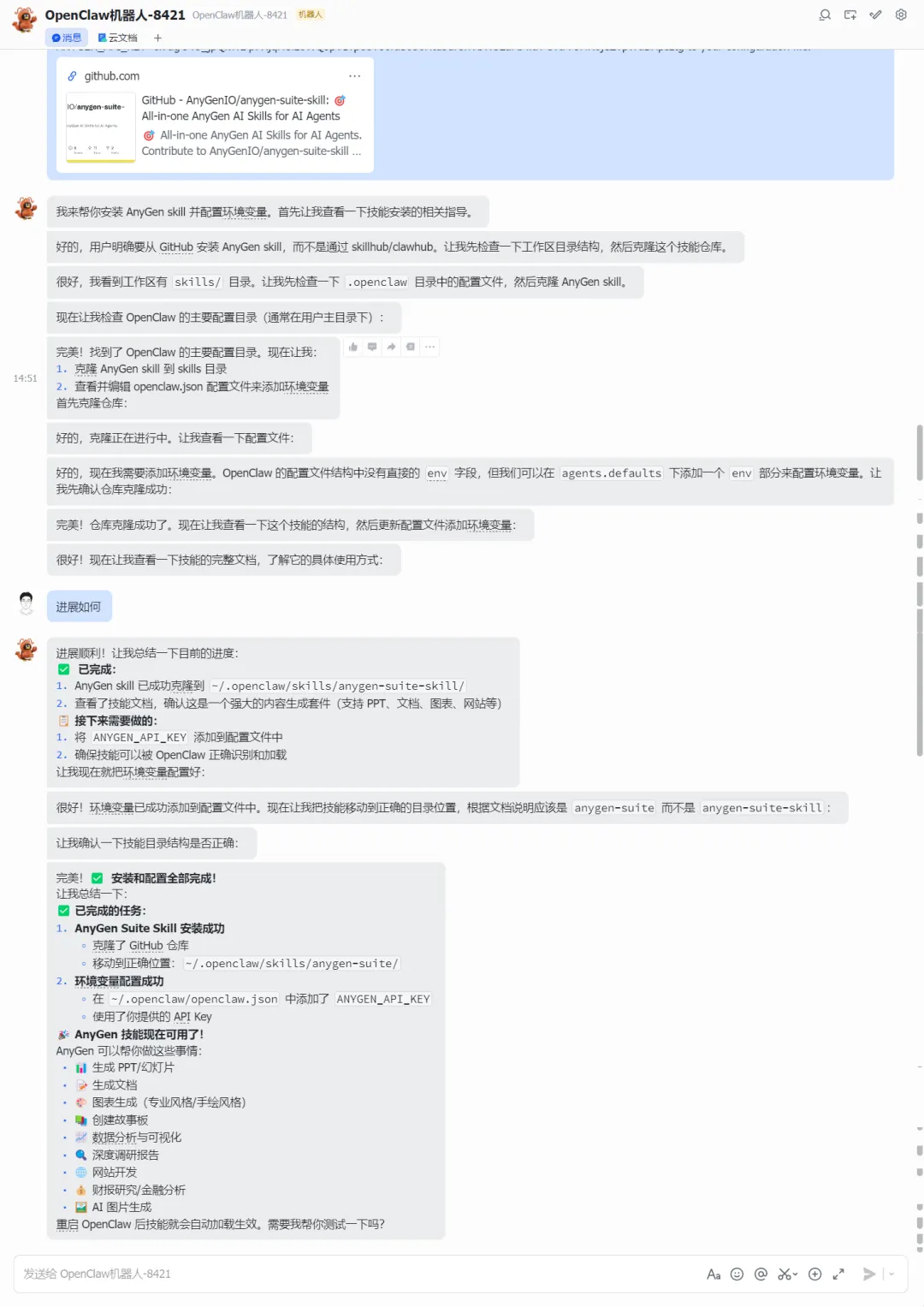 然后OpenClaw就开始自动下载、安装这个AnyGen Skill。