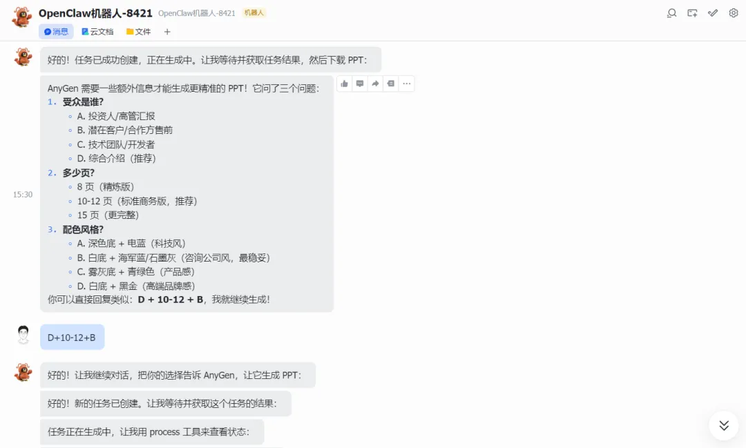 而这一切的背后,其实都是AnyGen平台在处理。OpenClaw是那个跟你对话的助理,AnyGen是那个在后面真正干活的技能引擎。