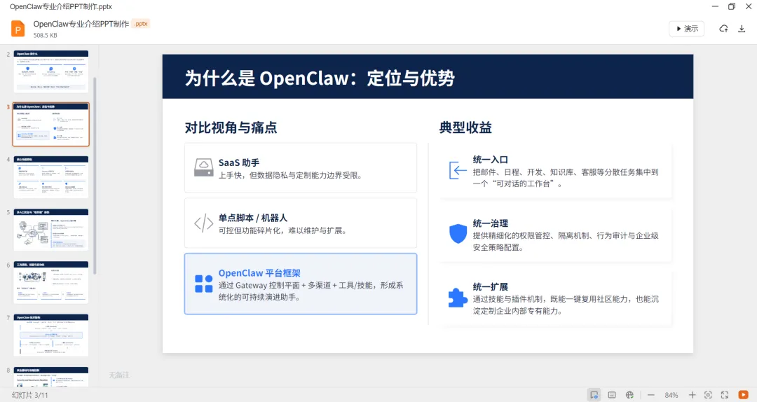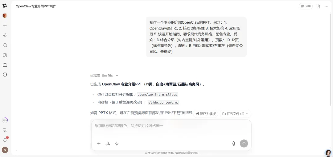 装好之后,我直接甩了一句,帮我做个介绍OpenClaw的PPT。