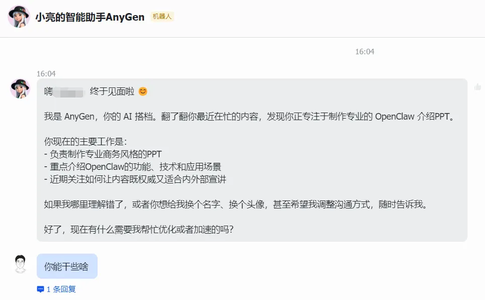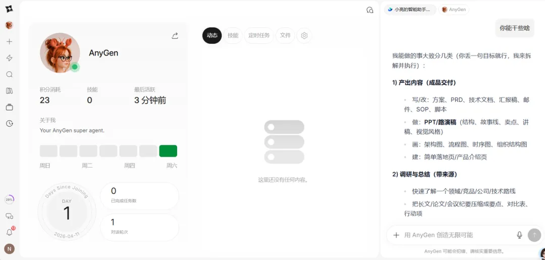 不过今天的重点不是AnyGen平台本身,而是它和OpenClaw之间的化学反应。