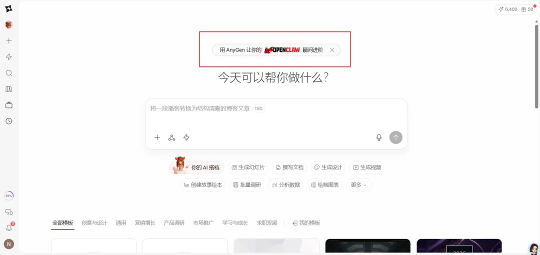 最近鬼使神差的又打开了一下,结果首页直接显示着一行字,「用AnyGen让你的OpenClaw瞬间进阶」。