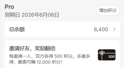 我一看,之前赠送的Pro会员还没过期,到6月多,账户里还躺着6000多积分。