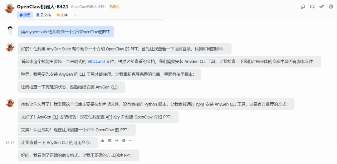 而这一切的背后,其实都是AnyGen平台在处理。OpenClaw是那个跟你对话的助理,AnyGen是那个在后面真正干活的技能引擎。